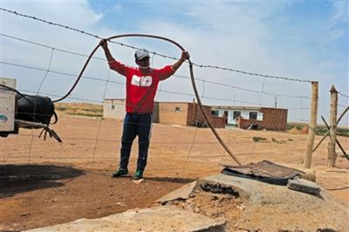 額里斯鎮(zhèn)特莫烏拉嘎察(村民組),是最接近化工園區(qū)的村民組,最近的居民離化工園區(qū)不過(guò)1公里。20歲的巴特爾(化名)就是這里的居民,記者看到他正在用太陽(yáng)能發(fā)電機(jī),從自家水井抽水注入儲(chǔ)水皮囊中,準(zhǔn)備澆灌幾里外菜園里的青菜。巴特爾的家在騰格里沙漠水源地上游,幾年前幾米下就能抽上水,現(xiàn)在水位下降至少40多米。