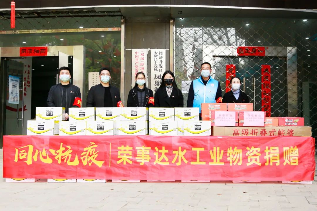 榮事達水工業集團在得知這一消息后,第一時間聯合黨支部來到長豐縣雙鳳開發區鳳巢社區黨群服務中心,為防控一線人員送去帳篷、方便面、飲用水等生活所需物資。