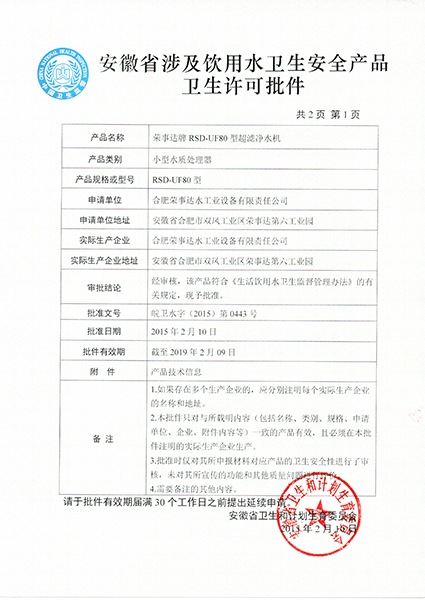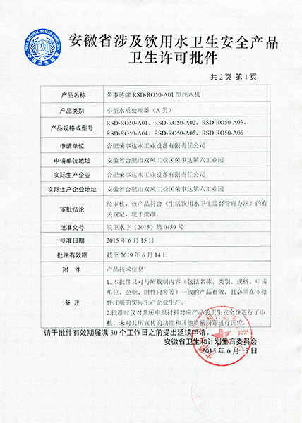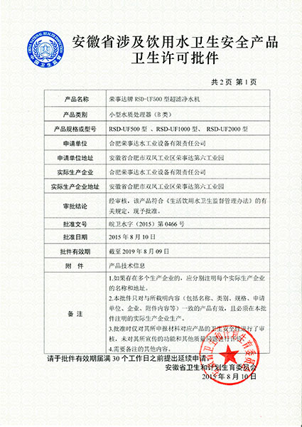 RSD-UF500超濾凈水機(jī)衛(wèi)生許可... -