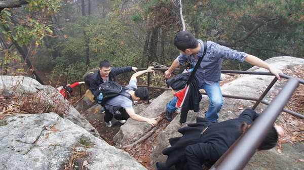 到達(dá)目的地用過午餐,全體成員便整裝待發(fā),完成此次拓展訓(xùn)練最艱難的項(xiàng)目--攀登天屏峰。天屏峰海拔高度1605米,山峰險(xiǎn)峻、陡峭無比,全路段多為樹根、石塊堆出的小道,多處攀爬必須手腳并用,甚至要靠隊(duì)友幫助,攀登而上極為挑戰(zhàn)體能。