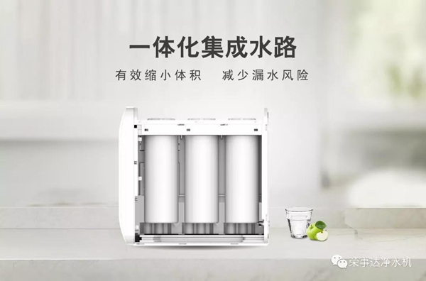 推陳出新的集成簡約式機身,相較于傳統的壁掛箱體或櫥下柱型可以說是一次完美的“瘦身”。385mm的迷你機身寬度要得益于內部創新一體化集成水路設計,一體注塑成型,接頭數由23減少到9,水路化繁為簡,不僅成為了一個“小可愛”,而且性能更加穩定,再加上無罐設計的錦上添花,榮事達400G智能反滲透凈水機算是真正實現了“時尚至簡”的視覺體驗和“靈活隨心”的安置效果。