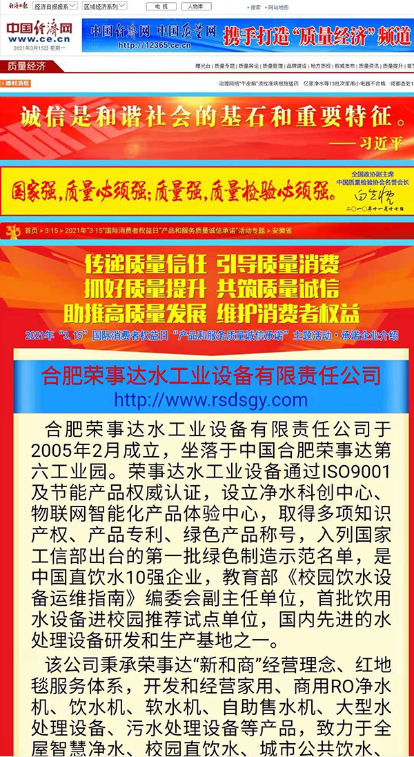 共筑質(zhì)量誠信,引導(dǎo)質(zhì)量消費(fèi)。在由中國質(zhì)量檢驗協(xié)會主辦的2021年“3.15”產(chǎn)品和服務(wù)質(zhì)量誠信承諾的主題活動中,榮事達(dá)憑借卓越的產(chǎn)品品質(zhì)及良好的社會形象,獲得協(xié)會以及權(quán)威專家的一致認(rèn)可,榮膺 “全國產(chǎn)品和服務(wù)質(zhì)量誠信示范企業(yè)”“全國質(zhì)量信得過產(chǎn)品”“全國凈水行業(yè)質(zhì)量領(lǐng)先品牌” “全國質(zhì)量誠信先進(jìn)企業(yè)”多項榮譽(yù),《中國質(zhì)量報》、《中國消費(fèi)者報》及中國質(zhì)量網(wǎng)、中國經(jīng)濟(jì)網(wǎng)、中國消費(fèi)網(wǎng)等多家媒體均予以集中展示和公告。