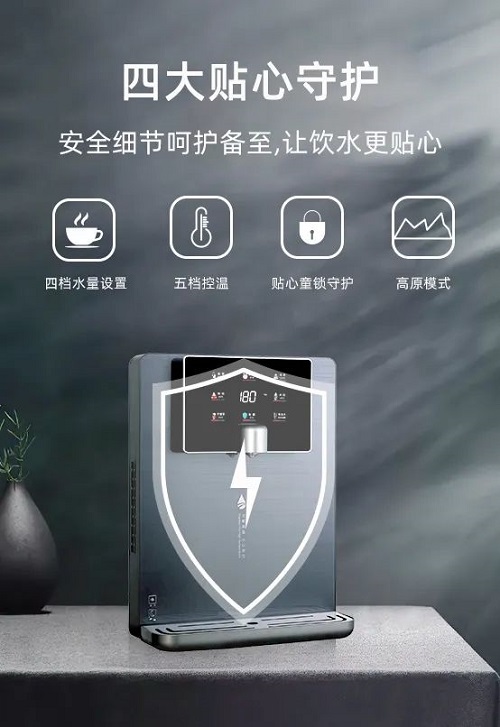 四大貼心守護,讓飲水更貼心。四檔水量設置,定量取水,無需等待;五檔控溫,專溫專飲,給您最適宜的溫度,滿足多種需求;貼心童鎖守護,童鎖鍵預防寶寶誤觸,避免安全隱患導致燙傷,安全細節呵護備至;內置高原模式,適應各類海拔高度,充分考慮高海拔地區家庭飲水需要。