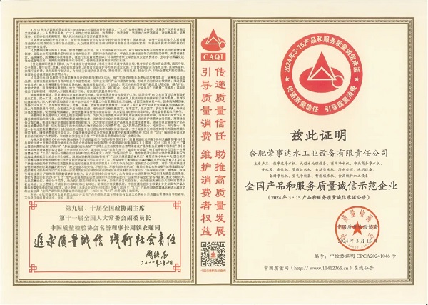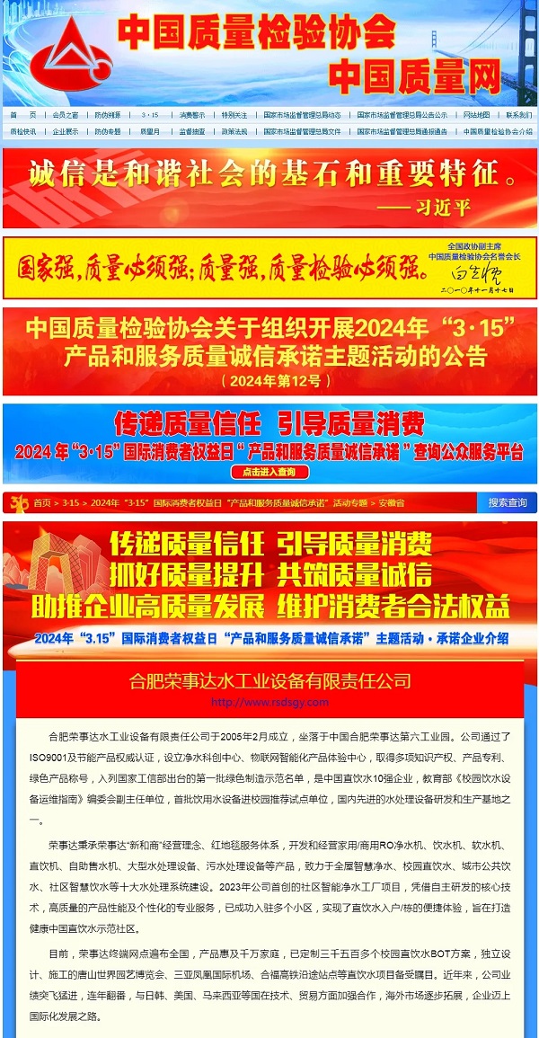 傳遞質量信任,引導質量消費。 在由中國質量檢驗協會主辦的2024年“3·15”產品和服務質量誠信承諾的主題活動中,榮事達水工業公司憑借卓越的產品品質及良好的社會形象,獲得協會以及權威專家的一致認可,榮膺 “全國產品和服務質量誠信示范企業 ”“全國凈水行業質量領先企業”“全國凈水行業質量領先品牌”“全國產品和服務質量誠信品牌”“全國質量檢驗穩定合格產品”“全國質量檢驗信譽保障產品”“全國消費者質量信譽保障產品 ”多項榮譽。